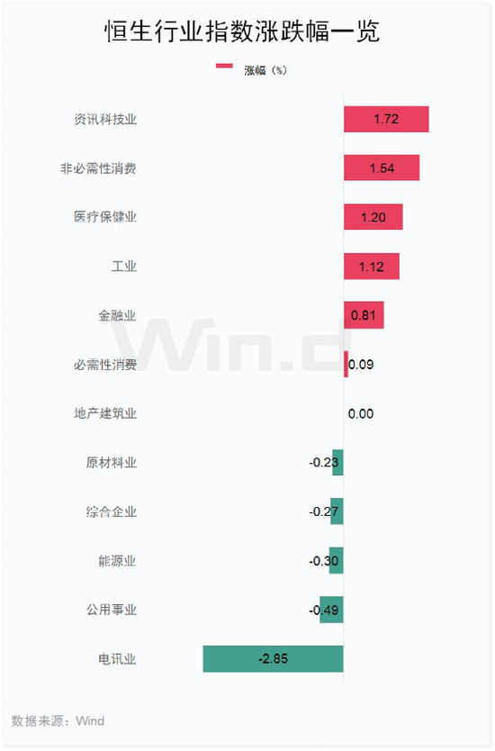 从行业表现看,恒生行业指数日内涨跌不一,资讯科技业涨1.72%,非必需性消费涨1.54%,医疗保健业涨1.2%。跌幅方面,电讯业跌2.85%,公用事业跌0.49%,能源业跌0.3%。