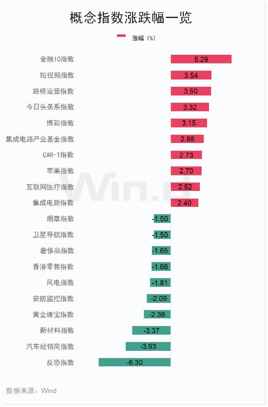 从盘面来看,Wind概念板块多数上涨,金融IC指数涨5.29%,短视频指数涨3.54%,路桥运营指数涨3.5%。跌幅方面,反恐指数领跌6.3%,汽车经销商指数跌3.93%,新材料指数跌3.37%。
