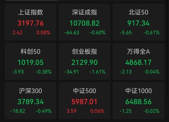 截至收盘,沪指涨0.08%,深成指跌0.6%,北证50跌0.61%,创业板指跌1.61%。