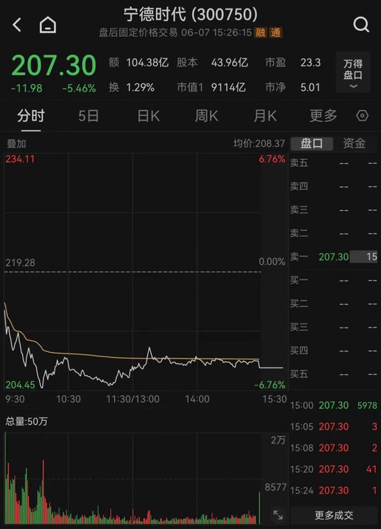 新能源板块受宁德时代大跌影响,总体表现比较低迷。6月7日尾盘,宁德时代成交额突破百亿,为4月21日以来首次,股价跌超5%。