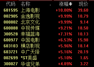 影视板块再度拉升,个股集体活跃。截至收盘,上海电影、金逸影视、北京文化(维权)涨停,中视传媒、幸福蓝海等多股涨幅居前。其中,上海电影获3天2板,北京文化3连板。