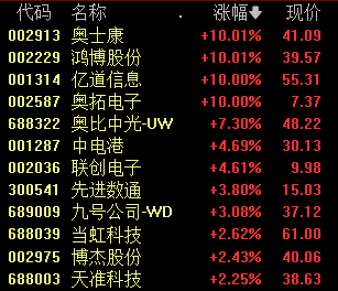 英伟达概念股再度走强,奥士康、鸿博股份、亿道信息涨停,奥比中光、先进数通等个股涨幅居前。