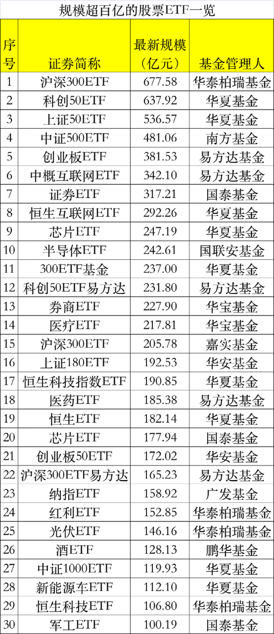 整体来看,截至6月6日,在今年A股市场持续调整的情况下,目前全市场百亿股票ETF数量为30只,目前规模前四强的宽基指数中,华泰柏瑞沪深300ETF规模677.58亿元,高居股票ETF规模首位,华夏科创50ETF、华夏上证50ETF规模分别达637.92亿元、536.57亿元,另外,南方中证500ETF、易方达创业板ETF、易方达中概互联网ETF、华泰证券ETF等规模也在300亿元之上。