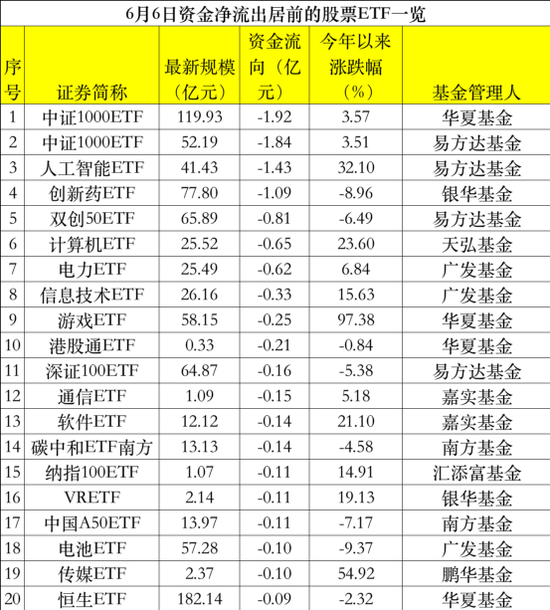 从6月6日资金净流出情况看,多只中证1000ETF资金净流出居前,比如华夏中证1000ETF、易方达中证1000ETF当日资金分别流出1.92亿元、1.84亿元。此外,和人工智能、计算机、算力、游戏相关的ETF产品资金净流出则较为明显,颇有落袋为安之意。