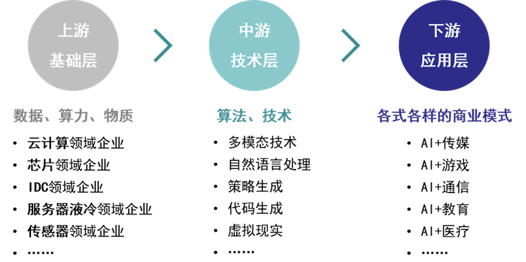 AI产业链主要由三个部分组成:上游的基础层,中游的技术层和下游的应用层。其中,上游基础层的数据、算力和物质服务为AI产业奠定了发展的基石;中游技术层为AI产业落地应用提供了关键技术支持;下游应用层是AI落地赋能千行百业的直接体现。