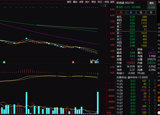 另一只股票奇信退(维权)(002781.SZ)上午开盘暴跌,盘中一度暴跌超过70%,后跌幅有所收窄,截至上午收盘,股价报0.53元,跌幅高达67.68%。
