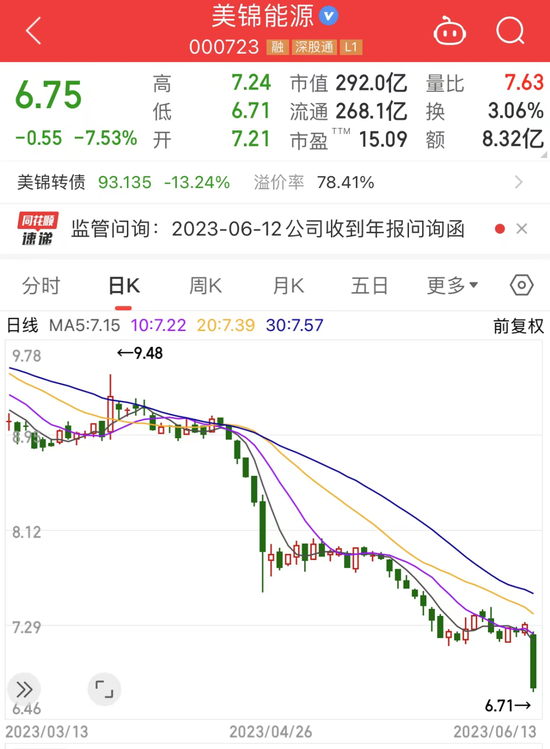 煤炭板块跌幅最大,权重股美锦能源大跌7.53%,最新市值近300亿。此外,该股转债也暴跌超13%。消息面上,6月12日,深交所对该公司下发了2022年年报问询函。