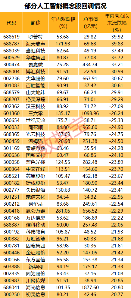 数据显示,人工智能概念股中,有38股年内涨幅超50%且最新价较年内高点回撤超20%。其中,罗普特(维权)、海天瑞声、当虹科技、华建集团、景嘉微、博汇科技等个股回撤均超30%。