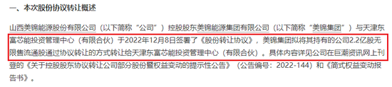 另外,在2022年12月底,美锦能源公告了控股股东一笔大额减持,美锦集团拟将其持有的公司2.2亿股无限售流通股(占公司总股本的5.09%)通过协议转让的方式转让给天津东富芯能投资管理中心(有限合伙)。每股转让价格为协议签署日的前一交易日收盘价的90%,即每股8.79元,目标股份转让价款合计19.34亿元。
