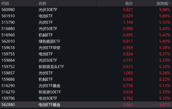 从今日股票ETF二级市场表现来看,光伏、电池、机械、新能源等行业主题ETF涨幅霸屏。