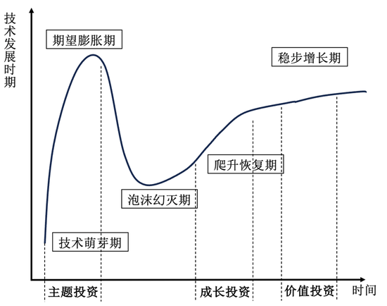 看似风格各异的三种方式如果用Gartner投资曲线联系起来,按照技术的发展期,对应的投资策略分别是:萌芽期-主题投资,应用期-成长投资,成熟期-价值投资。