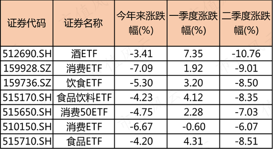 虽然7只ETF今年来涨跌幅均收负,但其实在一季度,除消费ETF(510150.SH)微跌0.59%外,其余全部收正。其中,酒类涨幅最好,超7%,食品饮料类的三只ETF涨幅也均超3个百分点。