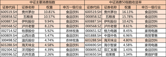 两个不同指数前十大成份股有一半是重合的,而中证消费50指数集中度更高,前十大权重高达78.5%,而另一只则为66.9%。