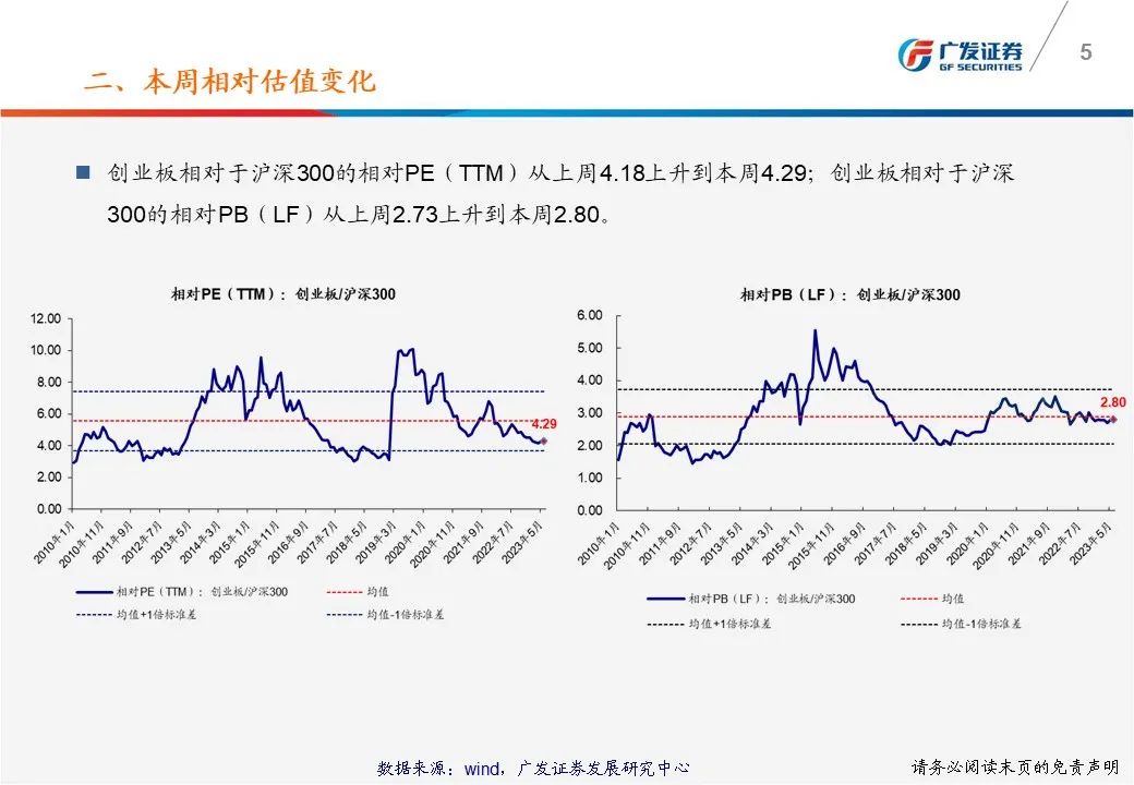 (5)创业板相对于沪深300的相对PE(TTM)从上周4.18上升到本周4.29;创业板相对于沪深300的相对PB(LF)从上周2.73上升到本周2.80。