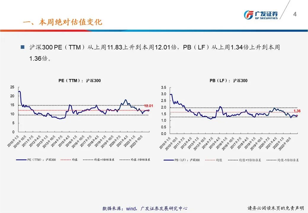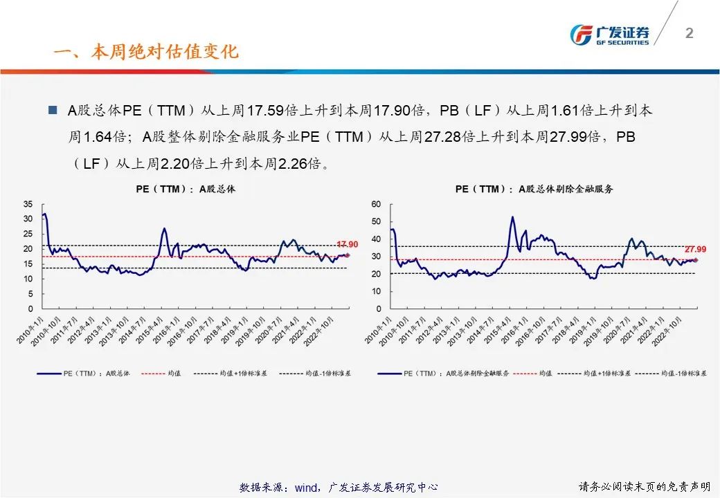 (1)A股总体PE(TTM)从上周17.59倍上升到本周17.90倍,PB(LF)从上周1.61倍上升到本周1.64倍;A股整体剔除金融服务业PE(TTM)从上周27.28倍上升到本周27.99倍,PB(LF)从上周2.20倍上升到本周2.26倍。