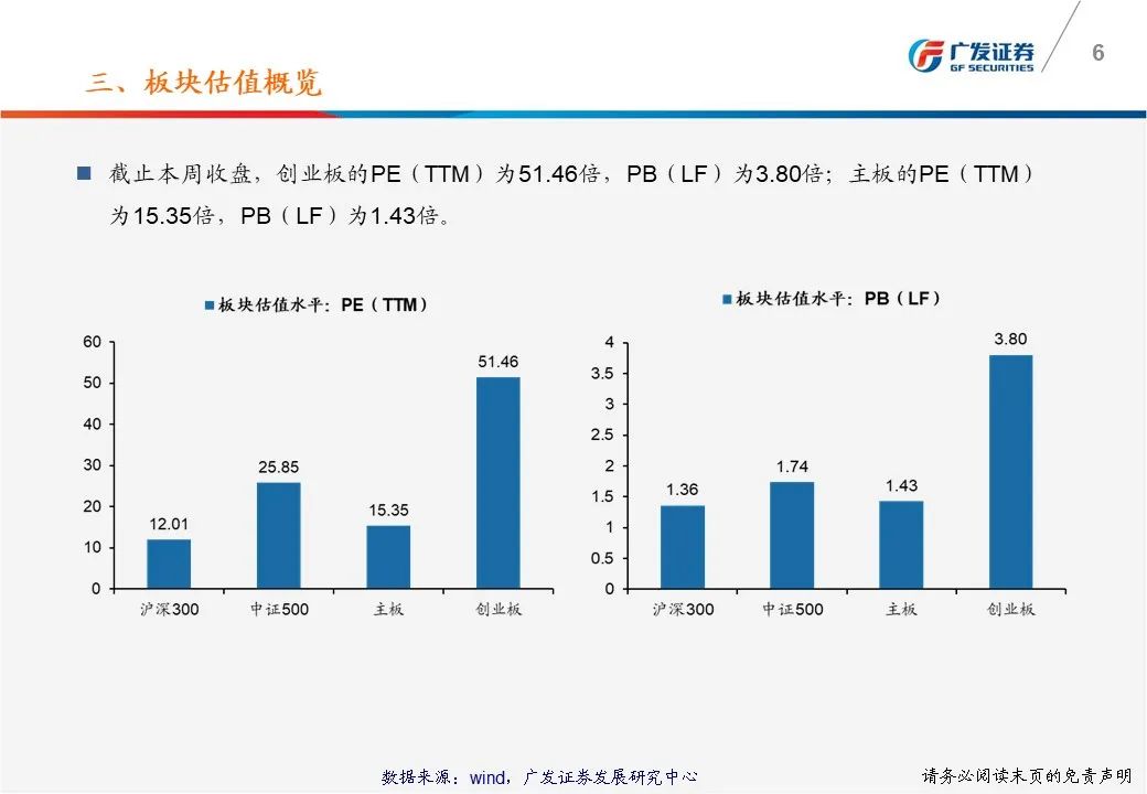 (2)创业板PE(TTM)从上周49.49倍上升到本周51.46倍,PB(LF)从上周3.65倍上升到本周3.80倍;科创板PE(TTM)从上周的60.82倍上升到本周62.20倍,PB(LF)从上周的4.24倍上升到本周4.34倍。