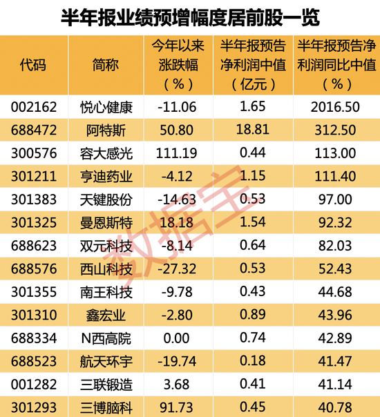 其后,阿特斯、容大感光、亨迪药业预计上半年净利润同比增幅中值分别为312.5%、113%、111.4%。