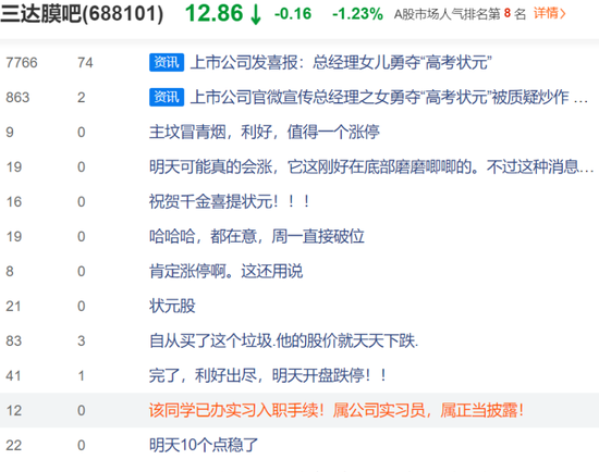 上市公司总经理女儿喜中状元,三达膜股民有庆祝的,戏称“周一开盘涨停庆祝”,也有羡慕的,更有股民将三达膜称为“状元股”。