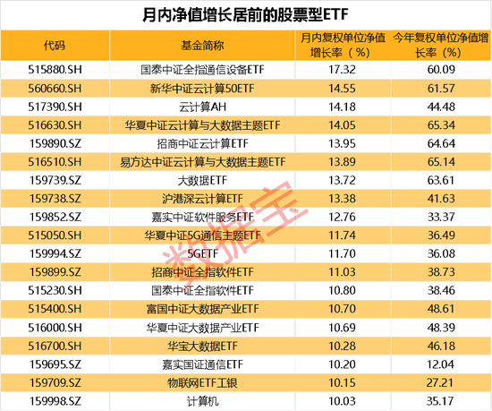 艾小军管理的国泰中证全指通信设备ETF的净值增幅最大,月内复权单位净值增长率达17.32%,其一季报披露的重仓股包含中兴通讯、工业富联、中天科技(维权)等热门概念股。新华中证云计算50ETF、云计算AH、华夏中证云计算与大数据主题ETF的月内复权单位净值增幅位居第2、第3和第4位,均超14%。