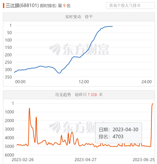 三达膜股票人气也随之暴涨。从东方财富股吧看,三达膜在6月23日股吧人气还在5000名开外,而最新人气已涨至股吧第9名。