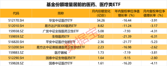 今年医药主题基金“跌声一片”,但资金却借道ETF抄底,呈现出越跌越买的势头。华宝中证医疗ETF的份额增长最多,月内增长34.26亿份,最新份额达到529.92亿份,基金份额创历史新高。该基金月内复权单位净值下跌3.91%,年内净值累计下跌16.44%。与之相似的还有易方达沪深300医药ETF,广发中证全指医药卫生ETF等。