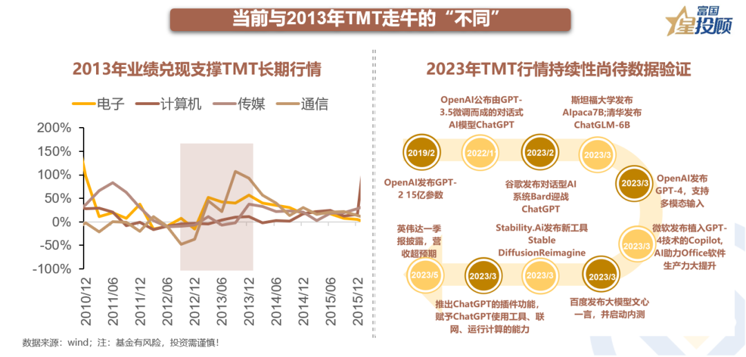 2023年在基本面、政策面、产业趋势以及资金面等方面与2013年TMT牛市背景均存在相似之处。从基本面看,当前国内经济仍处弱复苏阶段,且海外衰退风险加剧下出口或持续形成拖累,分化式复苏行情下市场寻求结构性亮点;从政策面看,2月中共中央、国务院印发《数字中国建设整体布局规划》,为数字中国的建设指明了方向;就产业趋势而言,海外创新大周期下,AI引领新一轮科技创新的潮流;就资金面而言,以新发基金份额为代表的权益市场增量资金暂未出现显著回暖,市场以存量博弈为主, TMT板块基金重仓股合计占比从2022Q4的15%提升至2023Q1的20%,机构调仓有所显现。