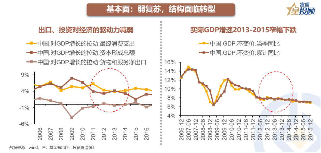 一方面,金融危机、欧债危机冲击下全球经济衰退风险上升,外需回落持续拖累净出口;另一方面,随着4万亿刺激政策效果逐渐退潮,投资对经济增长的驱动力亦有所减弱。国内经济经过两年的快速下行后步入平台期,2013-2015年实际GDP增速在7%-8%左右窄幅震荡,结构上则面临转型问题,市场研究的重心从判断整体收益β的方向,转向寻找优质板块的超额收益α。