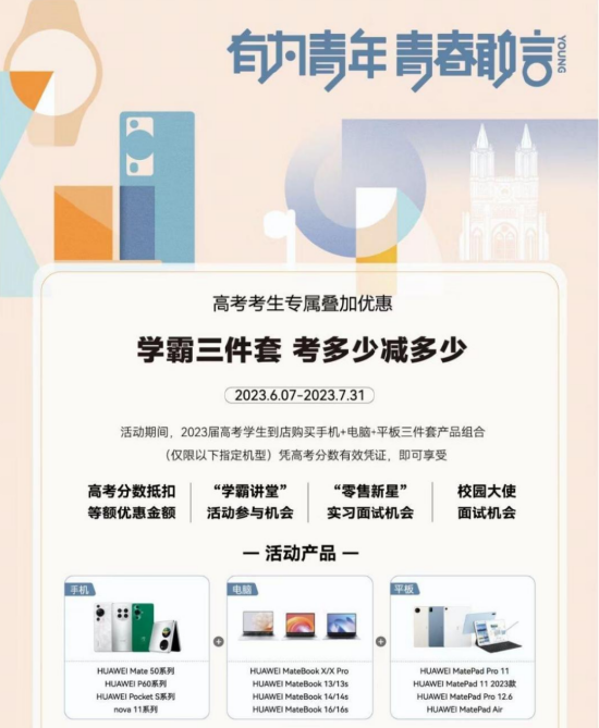 据了解,该政策名为“学霸三件套 考多少减多少”的优惠活动,活动时间为6-7月之间。高考后,华为多家线下门店对该政策的宣传,吸引了不少高考学子的关注和询问。
