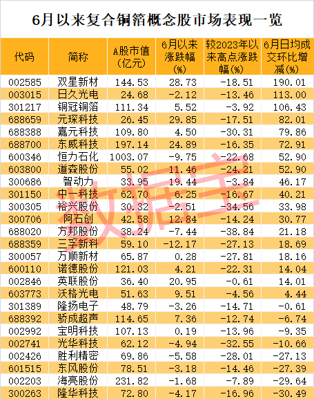 证券时报·数据宝统计,6月以来,截至最新收盘,复合铜箔概念股平均涨幅4.97%,超同期上证指数6个百分点以上。从成交情况来看,6月以来日均成交额环比上个月增长的概念股占比接近七成,双星新材、日久光电、铜冠铜箔日均成交环比增幅翻倍。