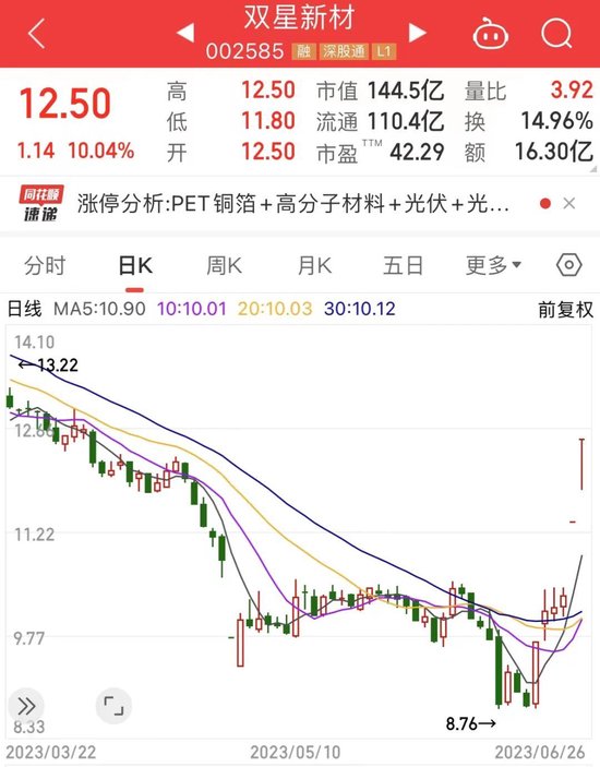双星新材今日以涨停价开盘,盘中一度回落至4%以下,随后股价又逐渐拉升,并封住涨停板,报收12.5元/股,收获两连板,这也是该股6个交易日内的第3个涨停板。