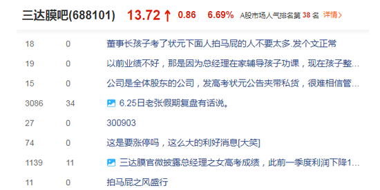 三达膜论坛里,投资者“炸锅”,有股民戏称:“重大利好”“明天一字板稳了,状元最少一个板”“恭喜‘女状元’”。