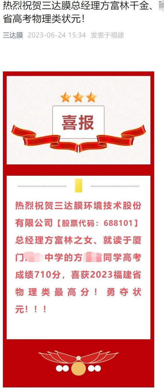 消息面上,6月24日,三达膜在官微发出一篇喜报文章,祝贺总经理之女勇夺“高考状元”,并收获了“10万+”阅读。