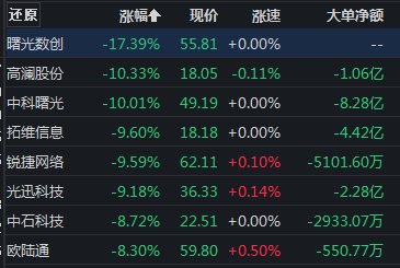 AI概念股跌幅居前。服务器方面,中科曙光触及跌停,浪潮信息、拓维信息、工业富联、申菱环境等大跌。