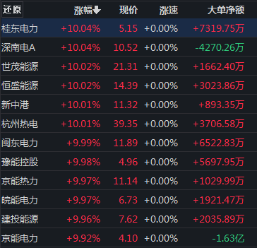 电力板块全天强势,桂东电力、深南电A、恒盛能源、新中港、杭州热电等十余股盘中涨停。