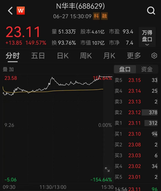 6月27日,四川华丰科技股份有限公司(N华丰)在上交所科创板上市。公司当日开盘价为21元,较发行价上涨126%。截至收盘,公司股价报23.11元/股,上涨149.57%,市值107亿元。