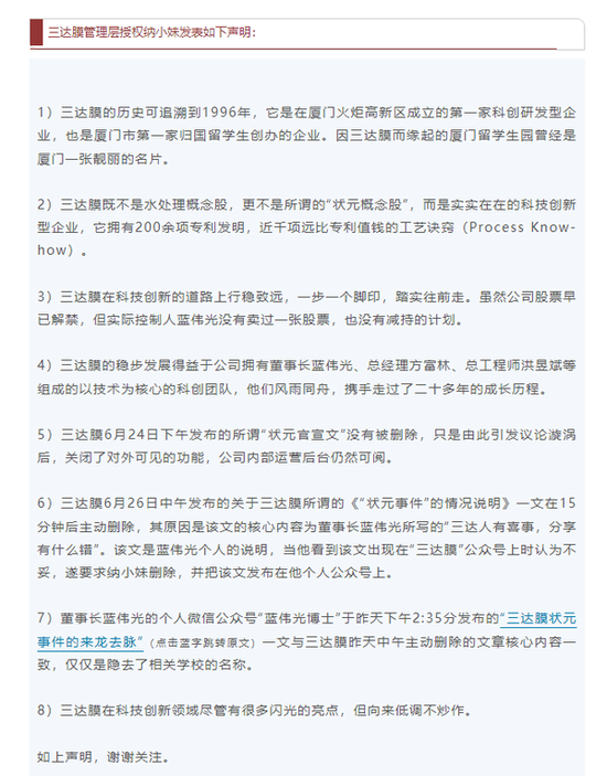 6月26日,三达膜董事长蓝伟光在公司公众号发文回应称:三达人有喜事,分享有什么错?以方总(总经理方富林)的女儿为荣耀,更为三达人有如此杰出的第二代而骄傲。