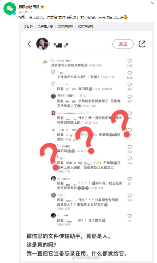 有传闻称传输助手是真人,“腾讯微信团队”微博对此回应称:抱歉,查无此人。你发给“文件传输助手”的小秘密,只有你自己知道。