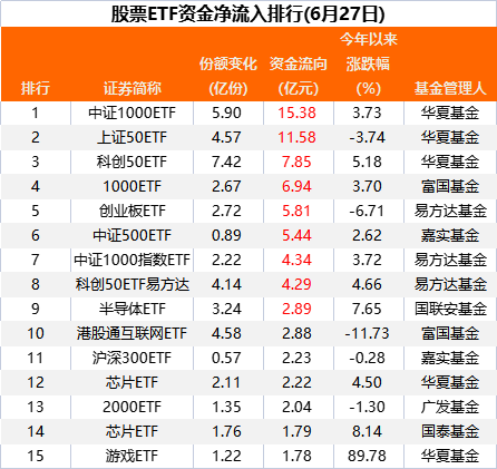 整体来看,上证50、中证1000以及科创50等大、中、小盘宽基指数则成为昨日“吸金”的指数。6月27日,净申购金额最多的为中证1000ETF,净申购金额15.38亿。此外上证50ETF也获申购居前,净申购金额同样超过10亿元,达到11.58亿元。此外,科创50ETF和1000ETF基金也获申购较多,净申购金额依次为7.85亿元和6.94亿元。