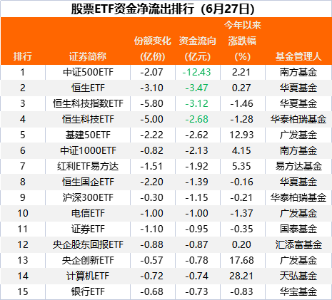 从资金净流出情况来看,宽基产品中证500ETF在6月28日资金净流出12.43亿元,成为当日“失血”最多的股票ETF产品。
