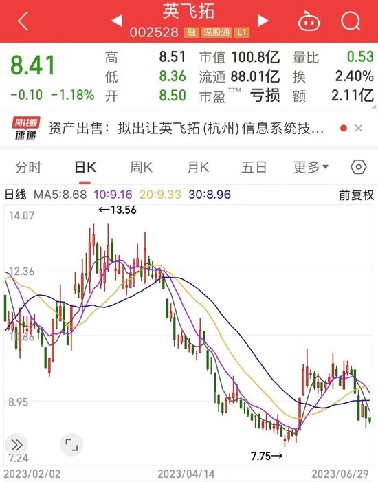 2022年,受益于信创概念爆发,英飞拓股价表现强劲,全年累计上涨201.61%,共录得33个涨停板,有“人气王”之称。相比之下,公司今年的股价表现要逊色许多,整体呈现震荡下行趋势,年内累计下跌25.04%。截至今日收盘,公司最新股价8.41元/股,总市值100.81亿元。