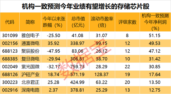 此外,机构一致预测通富微电、聚辰股份、复旦微电、紫光国微全年的净利润增幅均超30%。