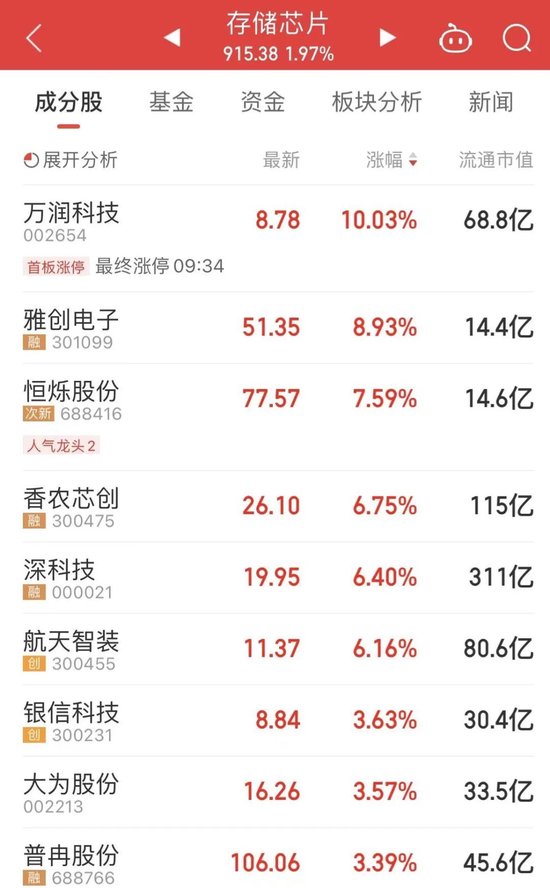 今日盘面上,存储芯片板块高开,万润科技涨停,雅创电子、恒烁股份等股跟涨。