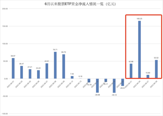 Wind数据显示,自6月21日跌破3200点以来,截止6月28日收盘,股票型ETF已经连续4个交易日净流入,其中,6月26日单日大举“吸金”165.25亿元,6月28日资金净流入也超过50亿元,全市场股票ETF4个交易日合计资金净流入高达272.46亿元。