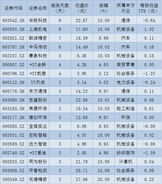 表:连续上涨3日且今日收盘涨停股一览
