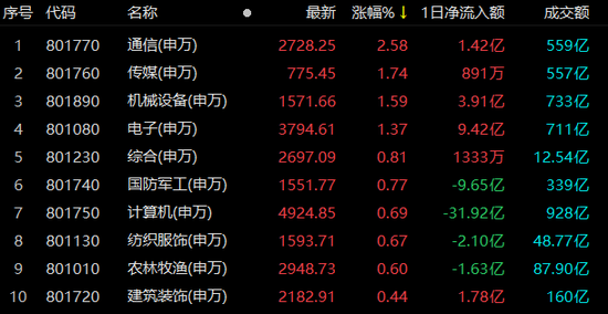 通信行业涨2.58%居首