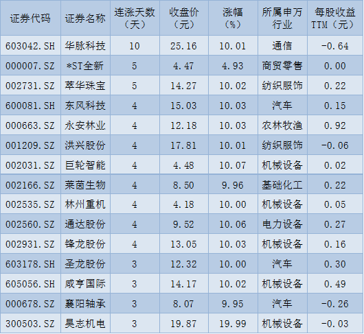 涨停股方面,今日有61只个股以涨停价报收,其中,有15只个股,股价已连续上涨超过3个交易日;跌停方面,有4只个股跌停价报收。从申万一级行业看,电子行业涨停股数量居首,达11只,紧随其后的是机械设备和基础化工行业,涨停股数分别为8只和6只。