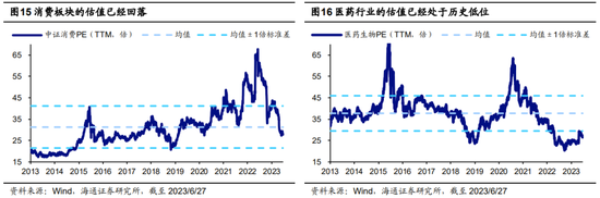 展望下半年,随着经济复苏和政策发力,消费基本面有望逐步改善。6月2日国常会提出要进一步稳定市场预期、优化消费环境,更大释放新能源汽车消费潜力;6月20日中共中央政治局常委、全国政协主席王沪宁在“恢复和扩大消费”调研协商座谈会上指出“要深刻认识恢复和扩大消费是推进中国式现代化的应有之义”,消费有望成为政策发力点。我们认为政策以大宗消费品为抓手,有望带动消费大盘的增长,我们预计今年社零总额增速有望达8-9%,22-23年两年平均增速为4-5%,疫情前社零总额增速在9-10%左右,因此未来改善的空间较大。随着政策效力显现,A股各消费行业的盈利有望改善,其中医药和基本消费部分子行业的盈利有望实现较快增长,结合海通行业分析师和Wind一致预测,我们预计23年医药板块中中药归母净利增速为20%、医疗服务为50%、创新药为30.0%,基本消费中食品加工为30%。叠加消费估值已经不高,我们认为消费的投资性价比已经凸显。