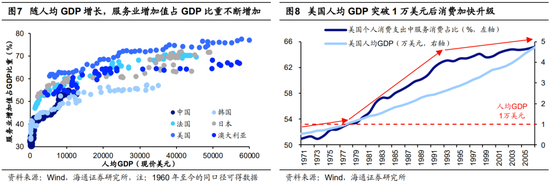 借鉴各发达国家经验,在人均GDP提升过程中,消费都存在升级的趋势。例如,随着美国人均GDP从1970年的0.5万美元增加到2021年的7.0万美元,美国服务业增加值比重从61.2%提升到77.6%;再比如与中国消费文化较为类似的日本,随着日本的人均GDP从1970年的0.2万美元提升到2020年的4.0万美元,其服务业增加值占比也从52.1%升至69.5%。分阶段看,当人均GDP迈过1万美元大关时,消费升级的进程显著加快。以美国为例,70、80年代美国经济由传统工业转型升级,在人均GDP和居民收入快速提升的过程中,服务类消费占个人消费支出的比重由1971年的51.1%提升至1990年的60.2%。分阶段看,美国人均GDP在1万美元以下时消费升级相对缓慢,1971-1978年美国服务消费占比年均提升仅0.3个百分点,1978年人均GDP跨过1万美元门槛后消费升级明显加速,1979-1992年服务消费占比年均提升0.7个百分点。