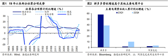 宏观方面,2022年以来,社零各分项中必选消费的增长仍较为稳健,其中粮油食品、饮料的同比增速维持在8%左右,但可选消费的增长偏弱,家电音像、汽车均经历了一段时间的负增长。其次,今年五一和端午假期旅游出行热度较高,使得市场对消费复苏充满期待,但数据公布后发现旅游收入的增长不及人次增长,尽管五一/端午期间旅游人次已恢复至2019年同期的119%/113%,但收入仅恢复至2019年同期的101%/95%,市场再次担忧居民消费能力。微观方面,拼多多业绩超预期引发了市场对中国消费降级的探讨,由于拼多多平台上所销售的产品多为平价商品,2022年拼多多营收达1306亿元,同比增长39%,归母净利润为315.38亿元,同比增长306%;今年一季度拼多多业绩再次超预期,23Q1营收为376亿元,同比增长58%,远超彭博分析师一致预期的323亿元,归母净利润为81亿元,同比大增212%,一定程度上反映平价商品的偏好在上升。此外,京东放缓的盈利增速加重了市场对消费降级的担忧,由于品牌高价商品在京东的占比较高,因而京东常被视为中高消费的代表,其23Q1营收为2430亿元,同比仅增长1.4%,归母净利润63亿元,同比扭亏,一定程度上反映中高端消费增长动能趋弱。