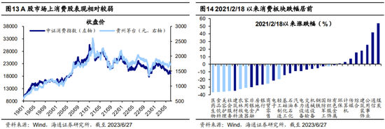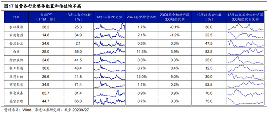 二级市场上消费板块的估值已经不高,随着基本面逐步改善,投资性价比逐步凸显。2022年以来投资者对消费降级的讨论也有二级市场上消费板块表现持续不佳的缘故,中证消费指数于2021/2/10触及高点后开始持续回落,截至2023/6/27(下同)最大跌幅为46%,累计跌幅40%;从细分行业层面看,食品饮料最大跌幅/累计跌幅为48%/36%,美容护理为48%/36%,医药生物为43%/37%;个股层面,贵州茅台和中国中免是我国中产崛起、消费升级的典型受益股,两者的股价表现较弱可能被误解为消费降级,贵州茅台最大跌幅/累计跌幅为48%/32%,中国中免为71%/60%。经历持续下跌后,消费多数行业的估值已经达到较低位,截至2023/6/27消费板块PE(TTM)/2013年来分位数为28倍/41%,食品加工为25倍/2%,医药生物为27倍/12%,农林牧渔为28倍/25%,家用电器为15倍/35%。此外,部分消费行业的基金仓位也已降至低位,例如轻工制造基金相对沪深300超配比例/2013年来分位数为0.4%/12.5%,家用电器为-1.2%/22.5%,纺织服装为0.3%/25.0%,医药生物为5.0%/30.0%。